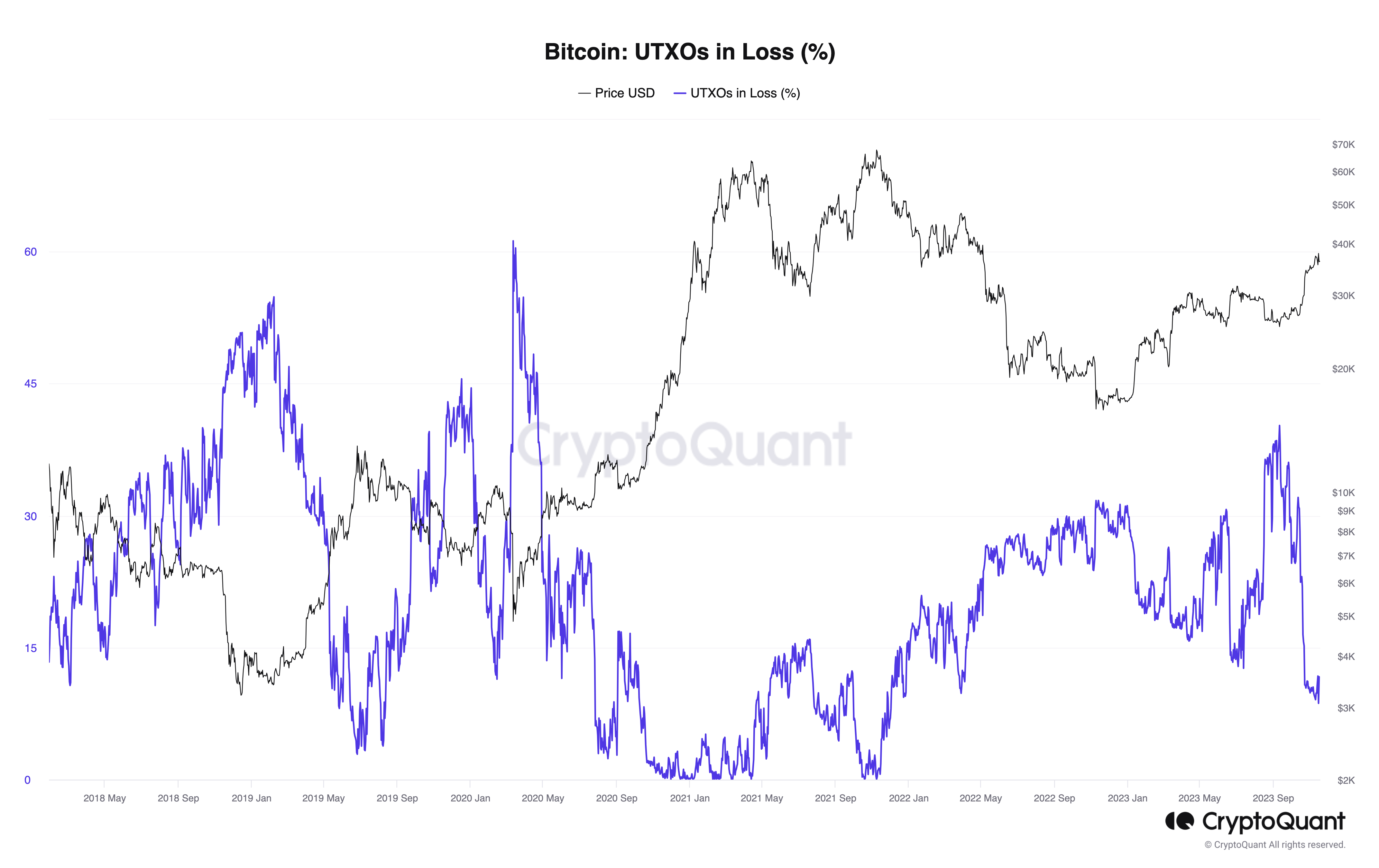 CryptoQuant data shows that the overall proportion of unspent transaction outputs, or UTXOs, currently at a loss is now just 11.6%.