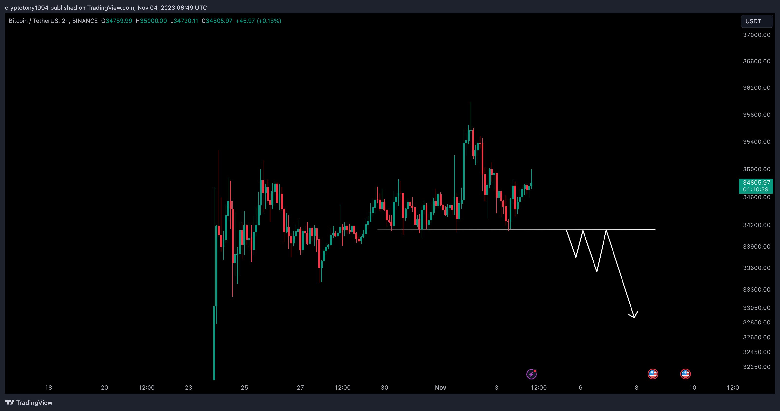 “Losing $34,100 is where i will look for a hedge short against my long position,” Crypto Tony told X subscribers in an update on his own market navigation.