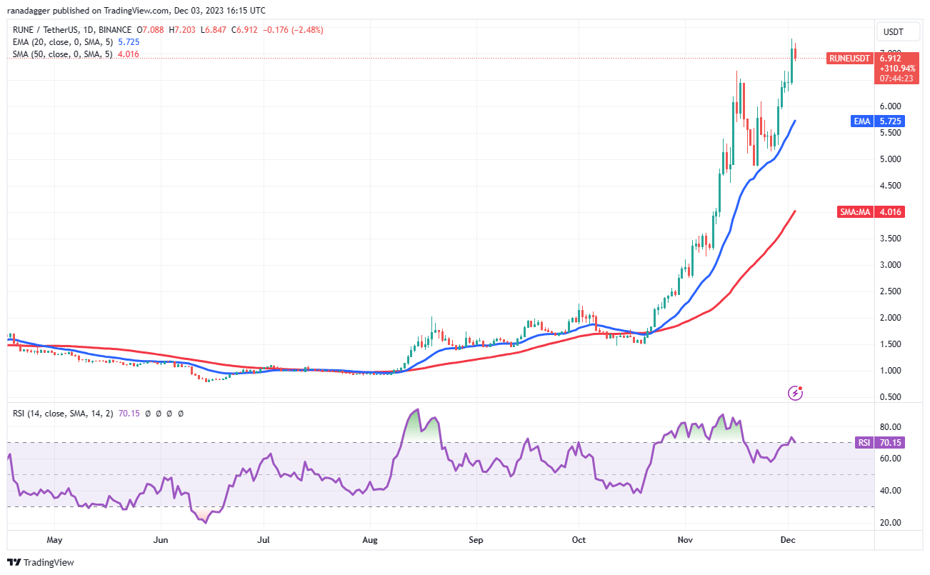 The bulls will try to maintain the price above $6.68, while the bears will attempt to sink the RUNE/USDT pair below the breakout level. If the sellers succeed, the pair may slump to the 20-day EMA ($5.72). The bears will have to yank the price below this level to indicate that the uptrend may be over.