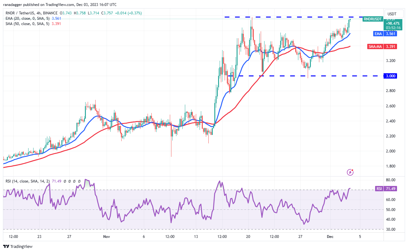 Render (RNDR) rebounded off the 20-day EMA ($3.21) on Nov. 30, indicating that the sentiment remains positive and traders are buying on dips.
