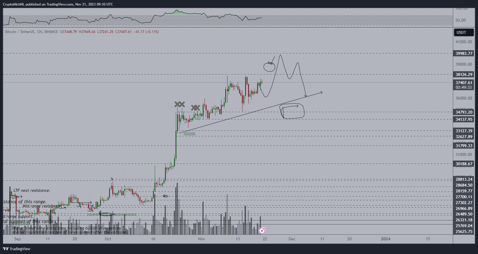 Popular analyst Matthew Hyland cautioned that the relative strength index (RSI) could be at risk of printing a bearish divergence with price should the latter fail to pass current 18-month highs just below $38,000.