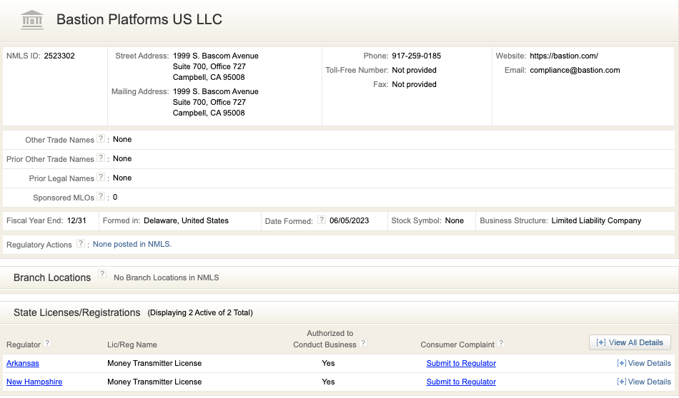The license acquisitions enable Bastion to participate in activities related to the selling or issuance of payment instruments, stored value, prepaid access, as well as the receipt of money and digital currency to facilitate transactions with others in the states. The licenses can be located on the official website of the Nationwide Multistate Licensing System (NMLS).
