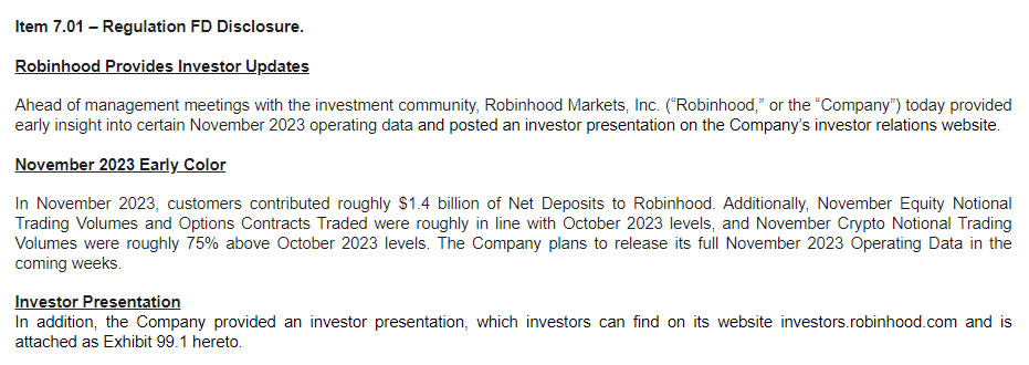 Robinhood’s 8-K report showing preliminary operating data for November 2023. Source: SEC